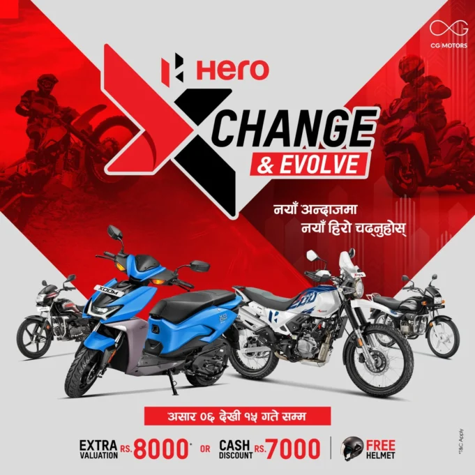 काठमाडौं । नेपालका लागि हिरो मोटोकर्पका आधिकारीक बिक्रेता सिजी मोटर्सले पहिलो पटक ‛हिरो एक्सचेञ्ज’ र इभल्भ सोरुम एक्सचेञ्ज आयोजना गरेको छ । बिहीबारदेखि सुरु भएको उक्त अफर असार १५ गतेसम्म संचालन हुनेछ । देशभर चल्ने उक्त मेलामा ग्राहकले कुनै पनि ब्राण्डका मोटरसाइकल एक्सचेञ्ज गर्दा बजार मूल्यांकन भन्दा ८ हजार बढीको मूल्यांकन पाउने आयोजकले जनाएको छ ।