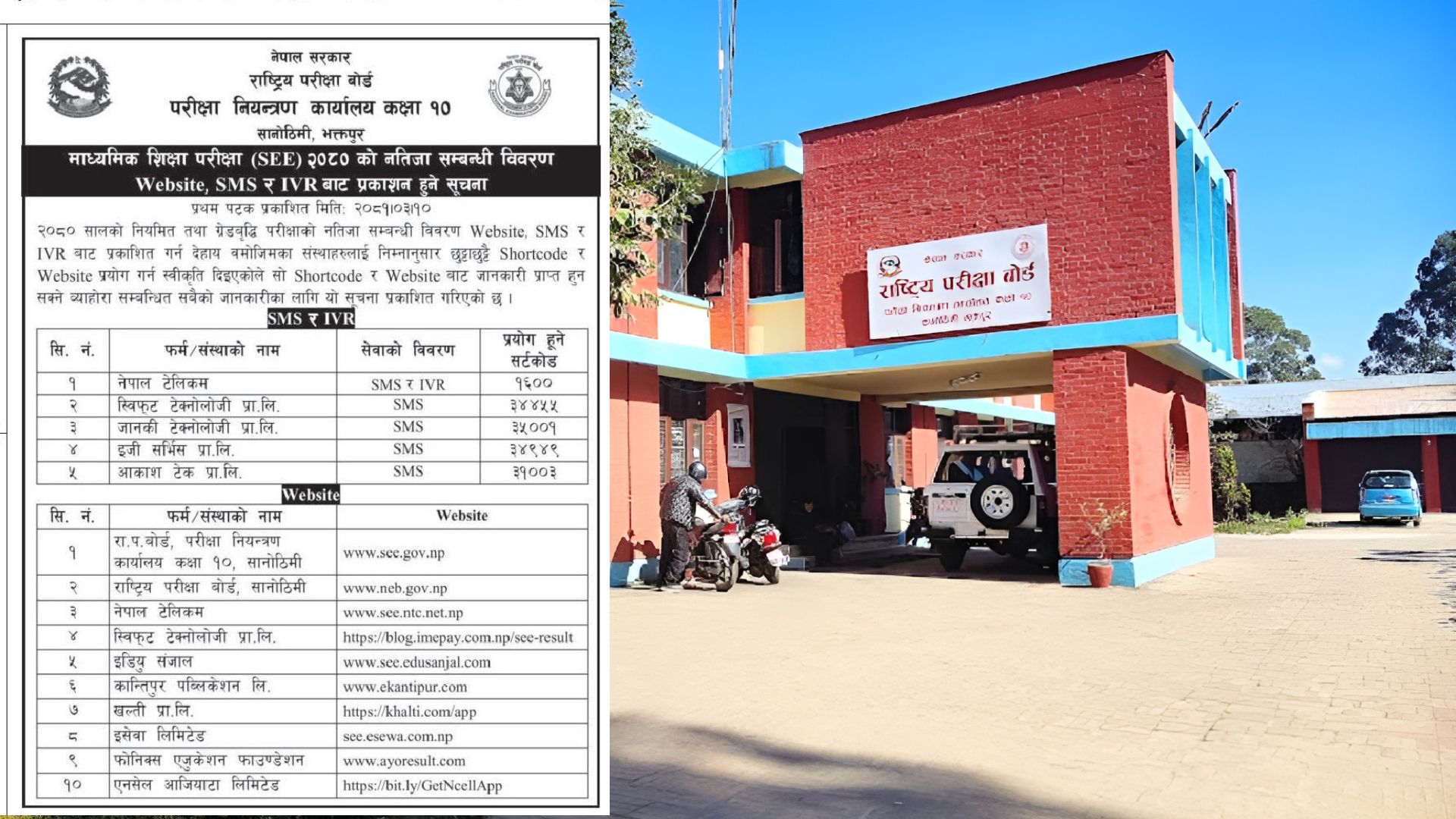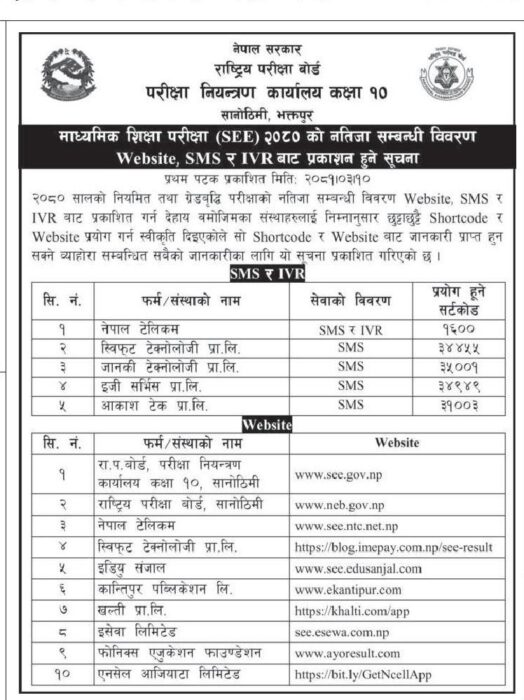 नतिजा हेर्न बोर्डले १० वटा वेबसाइट र पाँचवटा एसमएस सर्टकोड को व्यवस्था गरेको छ ।