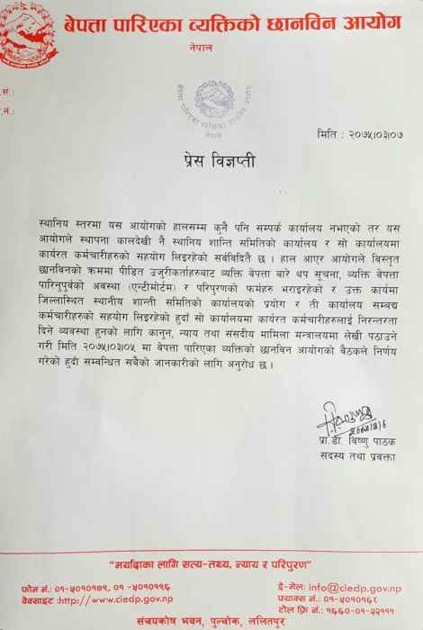 काठमाडौँ । बेपत्ता पारिएका व्यक्तिको छानबिन आयोगले स्थानीय स्तरमा स्थानीय शान्ति समितिको कार्यालय र ती कार्यालयमा कार्यरत कर्मचारीलाई निरन्तरता गर्न माग गरेको छ । प्रवक्ता डा. विष्णु पाठकले शुक्रबार विज्ञप्ति जारी गर्दै कार्यालय र कर्मचारीको निरन्तरता दिने व्यवस्था गर्न आयोगको निर्णयअनुसार कानुन न्याय तथा संसदीय मामिला मन्त्रालयलाई पठाउने निर्णय भएको जनाएका छन् ।