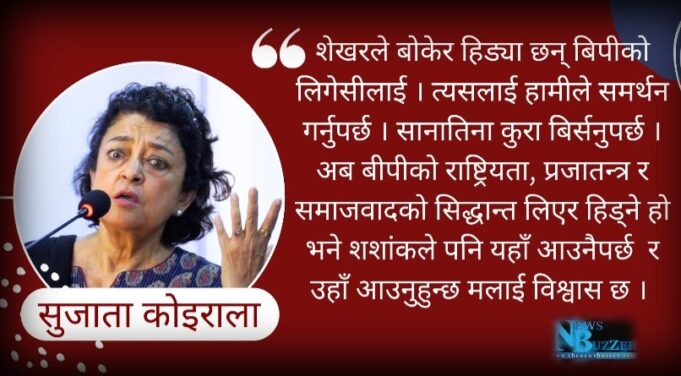 मैले सबै कुरा बिर्सेर अब शेखर काइरालाको नेतृत्व स्विकार्छु, शेखर काेइरालालाई हामीले अगाडि बढाउनैपर्छ । उहाँले जति सक्नुहुन्छ बल र बुत्ताले काम गरिराख्नुभएको छ । उहाँले बीपीको सिद्धान्त, गिरिजाबाबुको संगठनलाई बचाउने प्रयास गर्नुभएको छ । राष्ट्रियता, प्रजातन्त्र, समाजवाद जुन बीपीको भन्नुहुन्थ्यो त्यो कुरालाई हामीले अगाडि बढाउनुपर्छ । अहिले न राष्ट्रिय एकता छ, न प्रजातन्त्र छ नत समाजवाद नै छ । कुनै सिद्धान्त छैन। यो त एउटा सिद्धान्त दिएको हो नि बीपीको पार्टीको लागि । यो कुरा हामीले बिर्सिसकेका छौँ । गिरिजाबाबुले जुन सहमति, सहकार्य भन्नुभएको छ त्यो सहमति, सहकार्यलाई कायम राखेर नेपाली काँग्रेसले यो मुलुकलाई लिड गर्ने बेला आएको छ । हामीले लिड गर्ने हो ।