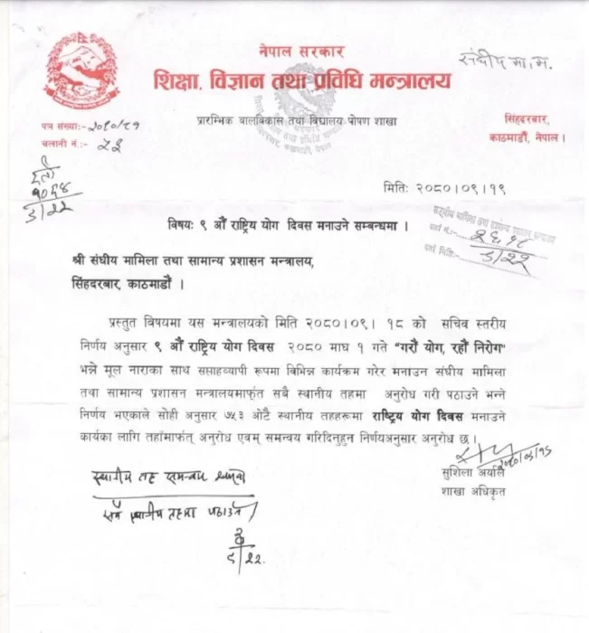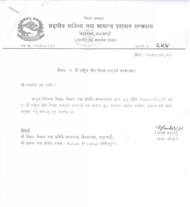 काठमाडौँ । संघीय मामिला तथा सामान्य प्रशासन मन्त्रालयले माघ १ गते योग दिवस मनाउन सबै स्थानीय तहलाई परिपत्र गरेको छ । शिक्षा, विज्ञान तथा प्रविधि मन्त्रालयको आग्रहमा सामान्यले स्थानीय तहहरुलाई ‘गरौं योग, रहौं निरोग’ भन्ने नारासहित योग दिवस मनाउन परिपत्र गरेको हो ।