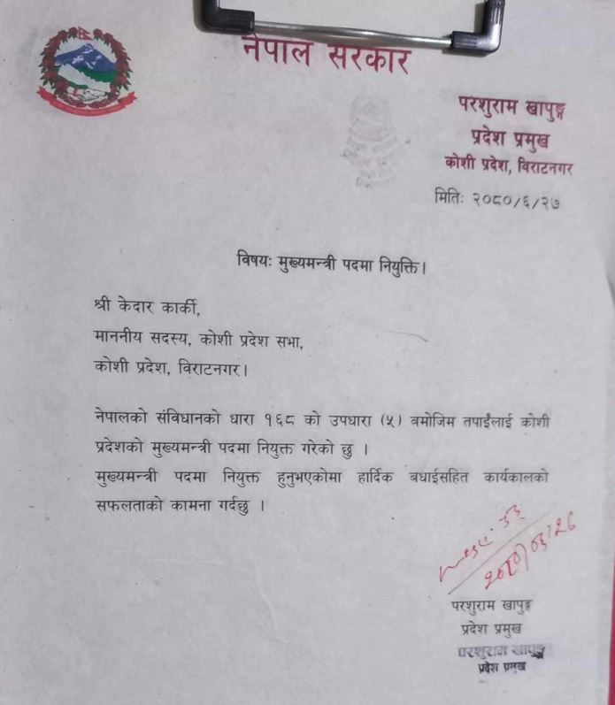 काठमाडौं, २७ असोज । कोशी प्रदेशको मुख्यमन्त्रीमा केदार कार्की नियुक्त भएका छन । सत्तारुढ गठबन्धनवाट नेकपा माओवादी केन्द्रका इन्द्रबहादुर आङबो र नेकपा एमालेको समर्थनमा नेपाली कांग्रेसको बिद्रोही पक्षधर केदार कार्की मध्ये कसलाई मुख्य मन्त्री नियुक्त गर्ने हो ? भन्नेमा बारेमा बिबाद कायम रहेको बेला कार्की मुख्यमन्त्री नियुक्त भएका हुन् । हिजो साँझ ५ बजेसम्म दुईजनाको दावेदारी प्रस्तुत भए पछि प्रदेश प्रमुख परशुराम खापुङले आज दुवै पक्षका सांसदहरुको सनाखत गराउन बोलाएका थिए । जसअनुसार बिहान ८ बजे देखी सुरु भएको सनाखतमा कार्कीले बहुमत पुरयाए पछि कोशीमा कांग्रेसका बिद्रोही कार्की मुख्यमन्त्रीमा नियुक्त भएका हुन । प्रदेश प्रुमख खापुङले उनले नियुक्त गरिएको जानकारी दिएका हुन् । माओबादी नेता आङ्बोले गठबन्धनमा रहेका दलहरु मध्ये नेपाली कांग्रेसका २९, माओवादीका १३, नेकपा एसका ३ र जसपाका १ सांसदको हस्ताक्षर बुझाएका थिए भने कांग्रेसका बिद्रोही उम्मेदवार कार्कीले आफूसहित कांग्रेसका ९ तथा एमालेका ३९ सदस्यको हस्ताक्षरसहित कुल ४८ जनाको समर्थनसहित मुख्यमन्त्रीको दाबी गरेका थिए । आङबोले बुझाएको हस्ताक्षरमा आफनो नाम उल्लेख गरेको भन्दै कार्की समुहले आपत्ति जनाएको थियो । आङबोले बुझाएको पत्रमा राखिएको आफनो समुहका सांसदहरुको हस्ताक्षर नक्कली भएको दाबी गर्दै कार्की समुहले प्रतिबाद गर्दै आएको थियो । जसअनुसार आङबो समुह हस्ताक्षर सनाखतमा जान नसके पछि आज कार्कीलाई मुख्यमन्त्रीमा नियुक्त गरिएको हो । सो आन्तरिक बिबादका कारण उत्पन्न परिस्थीतिका बारेमा परामर्श गरेर आज निर्णय लिने प्रदेश प्रमुख खापुङले जानकारी गराएका छन । जसअनुसार कोशीमा आज नयाँ मुख्यमन्त्री नियुक्त हुनेछन् ।