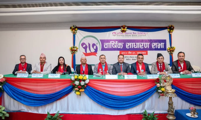 काठमाडौँ । गरिमा विकास बैंक लिमिटेडको सत्रौं बार्षिक साधारणसभा मिति पोखरामा सम्पन्न भएको छ । उक्त साधारणसभाले शेयरधनीहरुलाई ९.५० प्रतिशत बोनश शेयर र कर प्रयोजनार्थ ०.५० प्रतिशत नगद लाभांश गरी जम्मा १०% लाभांश वितरण गर्ने प्रस्ताव पारित गरेको छ ।