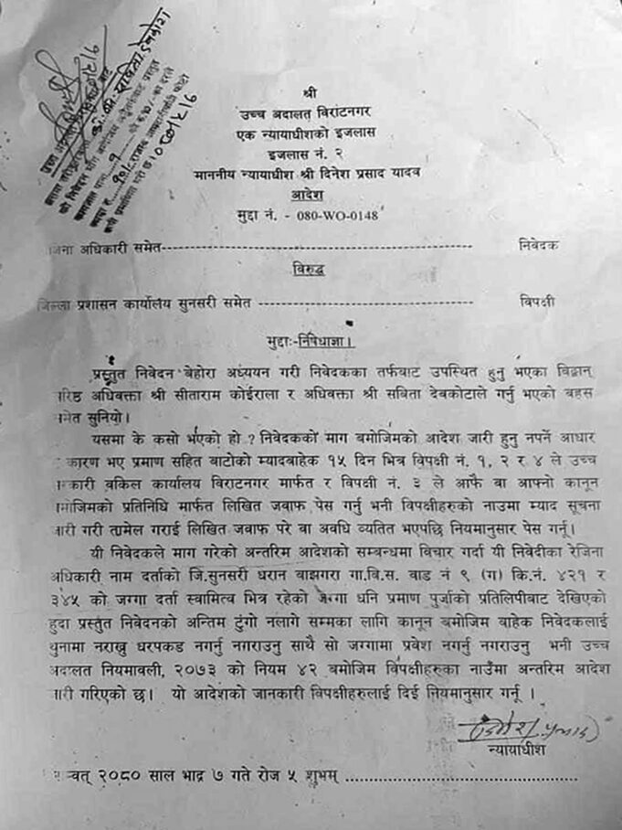 विराटनगर, ८ भदौ । उच्च अदालत विराटनगरले सुनसरीस्थित धरान उपमहानगर पालिकाका प्रमुख हर्क राज राई (हर्क साम्पाङ)लाई व्यक्तिका जग्गामा प्रवेश नगर्न आदेश दिएको छ ।
