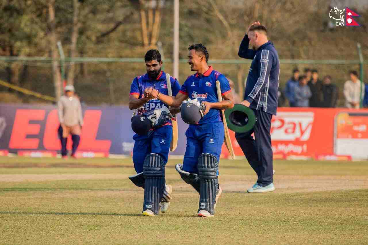 नेपालका लागि कुशल मल्लले ९२ रनको योगदान गरे । पाँचौँ नम्बरमा क्रिज समाल्न आएका उनले केवल ४१ बलको सामना गरी नौ छक्का र तीन चौका हिर्काए । उनको विकेट हारुन अर्सदले लिएका थिए । कुशलले अर्धसतक बनाएलगत्तै नेपालका अर्का अनुभवी ब्याट्सम्यान दीपेन्द्रसिंह ऐरीले पनि अर्धसतक पुरा गरेका थिए । दीपेन्द्रले पेभेलियन फर्किनुअघि टोलीका लागि ५७ रनको योगदान गरे । उनले ३४ बलको सामना गरी दुई छक्का र ६ चौका हिर्काएका थिए । नेपालले केवल ५५ रनको कुल स्कोरमा नेपालले चौथो विकेट गुमाएको थियो । त्यसपछि कुशल मल्ल र दीपेन्द्रसिंह ऐरीले नेपालको पाली समालेका थिए । उनीहरुले एक सय ४५ रनको उत्कृष्ट साझेदारी गरेका थिए ।