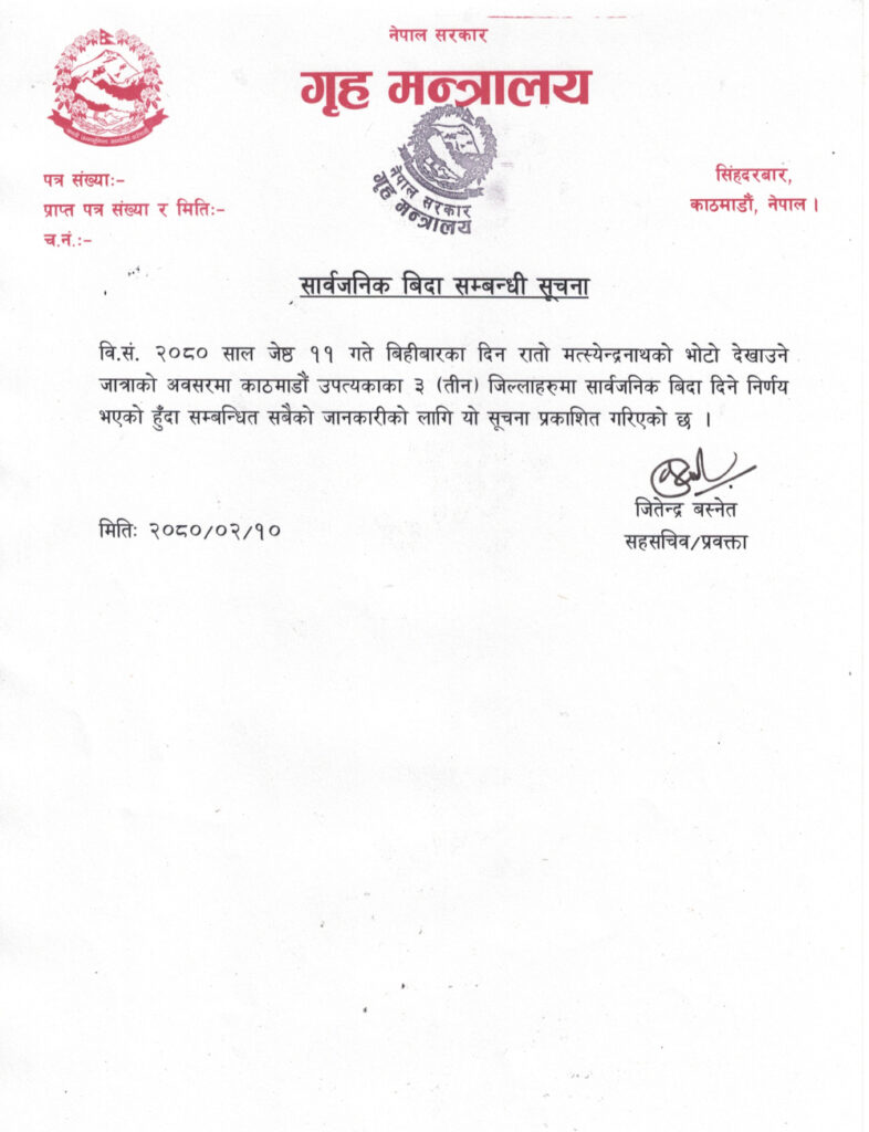काठमाडौं । गृह मन्त्रालयले भोलि काठमाडौं उपत्यकामा सार्वजनिक बिदा दिने निर्णय गरेको छ । सरकारले रातो मत्स्येन्द्रनाथको भोटो देखाउने जात्राको अवसरमा २०८० साल जेठ ११ गते बिहीबार काठमाडौं उपत्यकाका ९तीन० जिल्लाहरुमा सार्वजनिक बिदा दिएको हो ।