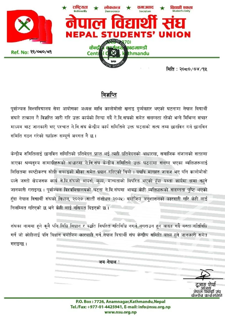 काठमाडौँ । नेपाल विद्यार्थी संघले मोरङ जिल्ला अध्यक्षलाई निलम्बन गरेको छ । पूर्वाञ्चल विश्वविद्यालय सेवा आयोगका अध्यक्ष प्राडा महेश दाहालमाथि कालोमोसो दलेको भन्दै नेविसंघले नेविसंघ मोरङ अध्यक्ष सरोज पोखरेललाई निलम्बन गरेको हो ।