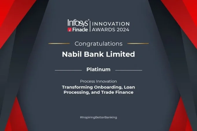 काठमाडौं । नबिल बैंक लिमिटेडले प्लेटिनम इन्फोसिस फिनाकल इनोभेसन अवार्ड जितेको छ । इन्फोसिस फिनाकल इनोभेसन अवार्ड २०२४ मा प्रोसेस इनोभेसनका लागि नबिलले प्लेटिनम अवार्ड पाएको हो । बैंकलाई अनबोर्डिङ, कर्जा प्रशोधन र ट्रेड फाइनान्सको सेवा सुधारमा गरेको योगदान स्वरूप यो अवार्ड दिइएको हो । यो अवार्ड अन्तर्गत १० विधामा २०० भन्दा बढी मनोनयन गरिएको थियो ।