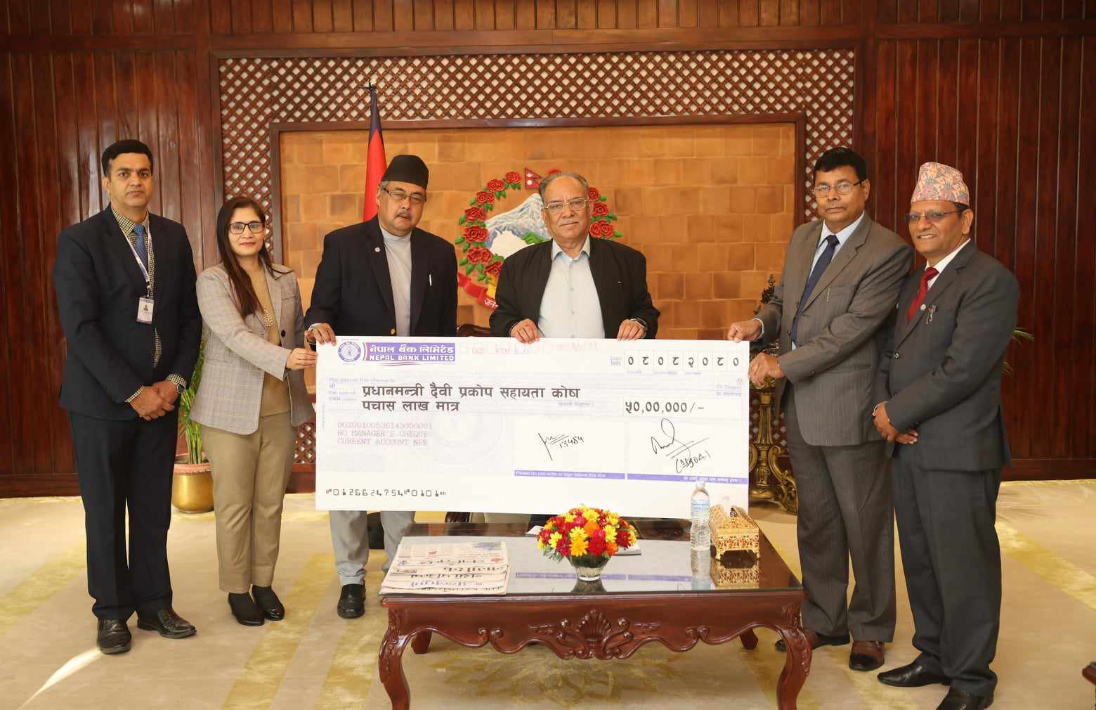 नेपाल बैंक लिमिटेडका अध्यक्ष चन्द्र बहादुर अधिकारी र प्रमुख कार्यकारी अधिकृत समता पन्तले बालुवाटार पुगेर प्रधानमन्त्री पुष्पकमल दाहाल ‘प्रचण्ड’ लाई आज बिहान उक्त रकम बराबरको चेक प्रधानमन्त्री दैवी प्रकोप उद्धार कोषका लागि हस्तान्तरण गरेका हुन् ।