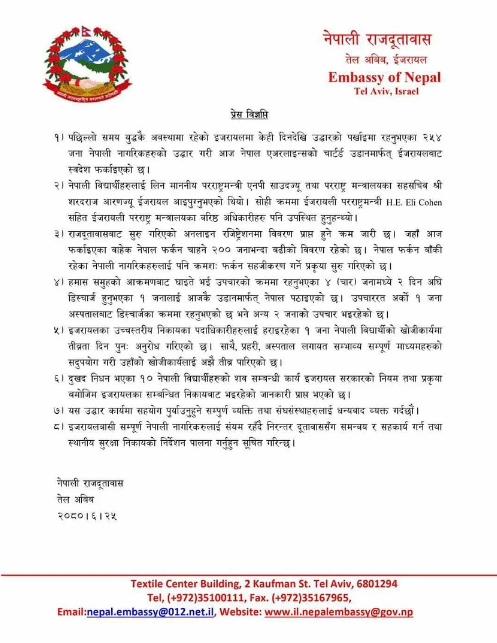 शुक्रबार एक विज्ञप्ति जारी गर्दै दूतावासले इजरायलमा बाँकी रहेका नेपालीलाई क्रमशः फर्कन सहजीकरण गर्ने प्रक्रिया सुरु गरिएको जानकारी दिएको हो ।