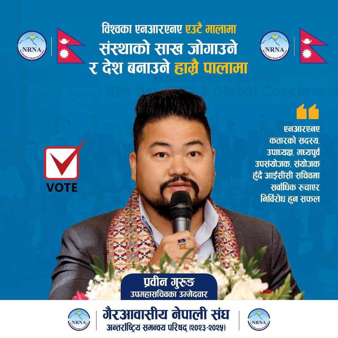कतार । गैरआवासीय नेपाली संघ (एनआरएनए) को आगामी कार्यकाल (२०२३–०२५) को लागि कतार निवासी प्रविन गुरुङले १२ बुँदे एजेण्डा सहित उपमहासचिव पदमा उम्मेदवारी घोषणा गरेका छन ।