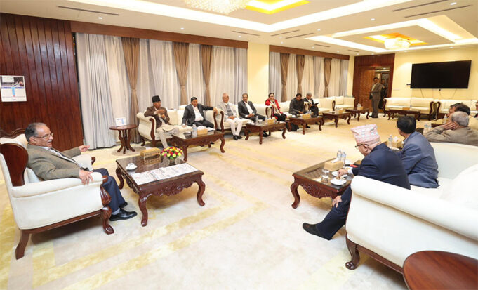 बैठकमा प्रधानमन्त्री पुष्पकमल दाहाल, नेपाली कांग्रेसका सभापति शेरबहादुर देउवा, नेकपा एकीकृत समाजवादी पार्टीका अध्यक्ष माधवकुमार नेपाल र जनता समाजवादी पार्टीका अध्यक्ष उपेन्द्र यादवसहित चार दलका नेताहरू सहभागी छन् ।