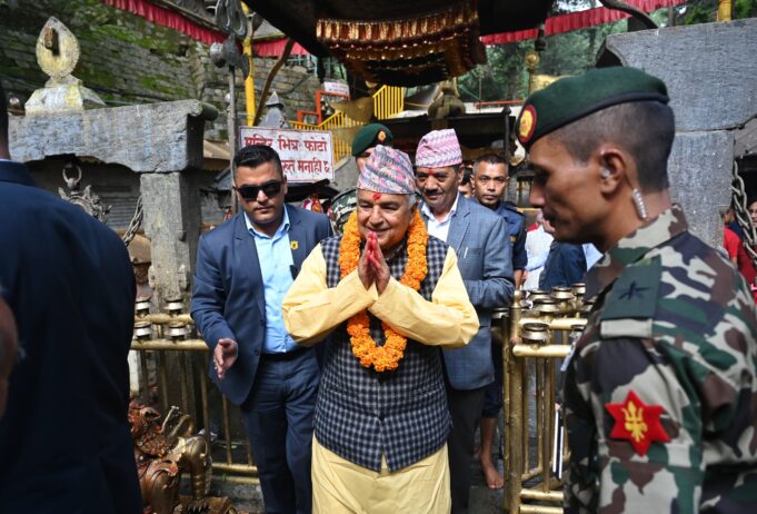 काठमाडौँ। राष्ट्रपति रामचन्द्र पौडेल प्रथम महिला सबिता पौडेलसहित बडादसैँको अवसरमा सोमबार बिहान दक्षिणकाली मन्दिर पुगेर दक्षिणकाली माताको पूजा अर्चना गर्नुका साथै पुजारीबाट टीका प्रसाद ग्रहण गरेका छन् ।
