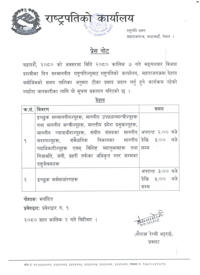राष्ट्रपति कार्यालयले बिहीबार जारी गरेको सूचनाका अनुसार ७ कात्तिक मंगलबार विजया दशमीका दिन विशिष्ट व्यक्ति र सर्वसाधारणलाई टीका लगाइदिने भएका हुन् ।