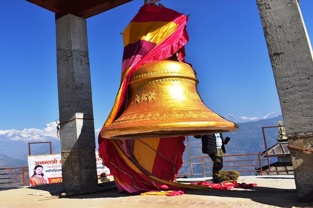 काठमाडौँ । बागलुङको सर्वसिद्धिधाम पञ्चकोटमा पाँच हजार पाँच सय ५५ किलोको मुक्तिनाथ महाघण्ट राखिएको छ। बागलुङ नगरपालिका- ५ स्थित पञ्चकोटलाई धार्मिक पर्यटकीय गन्तव्यका रूपमा विकास गर्नका लागि यहाँ महाघण्ट राखिएको हो । विसं २०७२ देखि पञ्चकोटमा धार्मिक संरचना बनाउन सुरु गरिएको थियो। गत साता मात्रै महाघण्टलाई पञ्चकोट ल्याइएको थियो। पञ्चकोटमा अहिलेसम्म सिस महल, गण्डकीमाताको मन्दिर, यज्ञशाला, हनुमानको विशाल मूर्तिलगायत दर्जनौं धार्मिक संरचना बनिसकेका छन्।विभिन्न दाताको सहयोग, महायज्ञबाट सङ्कलन भएको रकम र सरकारबाट भएको करोडौँको लगानीले अहिले पञ्चकोट देशव्यापी रुपमा चर्चित बनेको छ। पञ्चकोटलाई धार्मिक पर्यटकीयस्थलका रूपमा विकास गर्ने योजनाअनुसार उक्त महाघण्ट राखिएको मुक्तिनाथ पीठाधीश्वर स्वामी कमलनयनाचार्यले बताए । पञ्चकोटमा यही फागुन ९ गतेदेखि आयोजना हुने अनन्त श्री ब्रह्माण्डीय महायज्ञका अवसरमा महाघण्टको विधिपूर्वक स्थापना गरिने उनले बताए । मुक्तिनाथ महाघण्ट पञ्चधातु सुन, चाँदी, तामा, पित्तल र फलाम मिसाएर बनाइएकाले यो घण्टीलाई ‘महाघण्टी’ नाम दिइएको स्वामी कमलनयनाचार्य बताउँछन्। महाघण्टी बनाउन आठ वर्ष लागेको थियो।पञ्चकोटमा निर्माण गर्न लागिएको एक सय आठ फिट अग्लो गण्डकी विश्वशान्ति कलशको नजिकै महाघण्टी राखिएको उनले बताए। महाघण्टबाट निस्किएको ध्वनि साबिक धौलागिरिका बागलुङ, पर्वत, म्याग्दी र मुस्ताङका अधिकांश बस्तीमा सुन्न सकिने दाबी गरिएको छ । महाघण्ट बनाउन करिब रु दुई करोड खर्च लागेको अनुमान गरिएको कमलनयनाचार्यले बताए। उनले भने, ‘पञ्चकोटमा महाघण्ट राखिएको छ, यसमा शान्तिको ध्वनि निस्किनेछ, हामीहरुले अबको केही दिनमा अनन्तश्री ब्रह्माण्डीय महायज्ञको आयोजना गरेका छौं। त्यस अवसरमा घण्टको विधिवत् रूपमा प्राणप्रतिष्ठाको कार्य गरिने छ। धेरै समय खर्चिएर घण्ट बनेको छ, यसलाई यहाँ बन्दै गरेको गण्डकी कलशको आडमा राखिने छ । ’समुन्द्री सतहदेखि एक हजार सात सय ५० मिटरको उचाइमा रहेको पञ्चकोटमा धार्मिक संरचना निर्माणका लागि आठ वर्षअगाडि तत्कालीन प्रधानमन्त्री एवं नेपाली कांग्रेसका सभापति सुशील कोइरालाले शिलान्यास गरेका थिए। पछिल्लो समय मुस्ताङको मुक्तिनाथ, म्याग्दीको गलेश्वरलगायत ठाउँमा पुग्ने धार्मिक पर्यटक यहाँ आउन थालेपछि चहलपहल बढेको पाइन्छ।