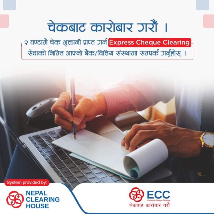 Express Cheque Clearing मार्फत २ घण्टामै चेक भुक्तानी सेवा प्राप्त हुने भएकाले आफ्नो बैंक/वित्तिय संस्थामा सम्पर्क गर्न नेपाल क्लियरिङ हाउस लिमिटेडले आग्रह गरेको हो । थप जानकारीका लागि तलको लिङ्कमा क्लिक गर्नुहोस्