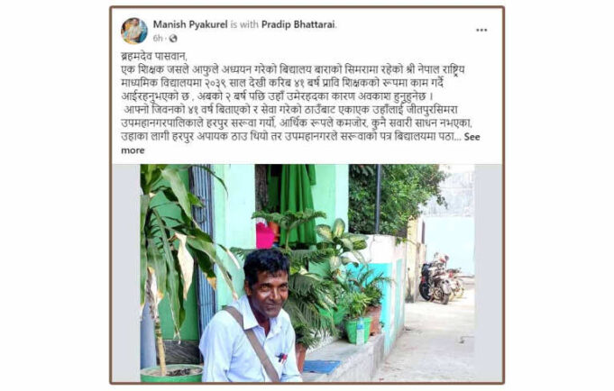 बारा, १६ असोज । गत शनिवार बिहानैदेखि सामाजिक संजाल फेसबकुमा शिक्षक ब्रम्हदेव पासवानको तस्वीर चर्चामा छ ।