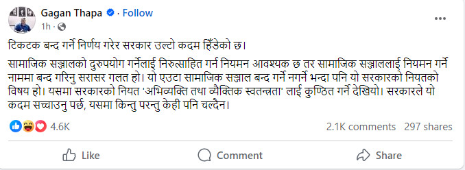 काठमाडौँ । नेपाली कांग्रेसका महामन्त्री गगन थापाले टिकटक बन्द गर्ने सरकारको निर्णय गलत भएको हुदा सरकारले यो निर्णय सच्चाउनु पर्ने र यसमा किन्तु परन्तु केही नचल्ने बताएका छन् । थापाले समाजिक सञ्जालमा स्टाट्स राख्दै सरकारले सामाजिक सञ्जालको दुरुपयोग गर्नेलाई निरुत्साहित गर्न नियमन आवश्यक भएपनि नियमन गर्ने नाममा बन्द गरिनु सरासर गलत भएको उल्लेख गरेका छन् ।