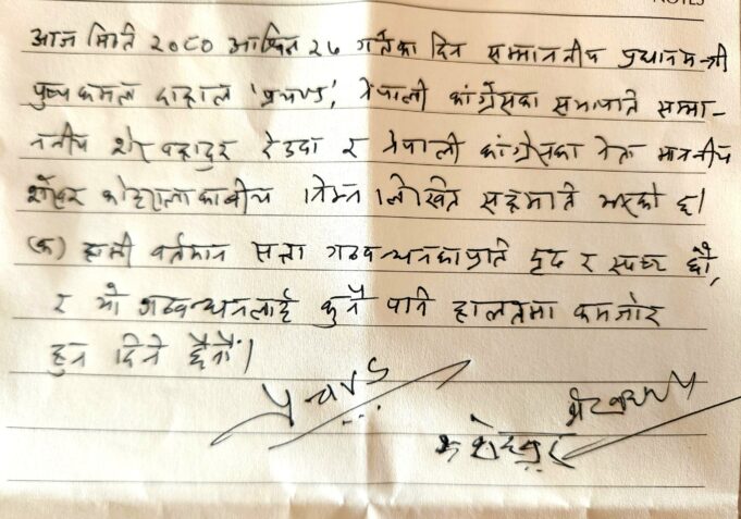 काठमाडौं, असोज २७ । प्रधानमन्त्री एवम् नेकपा (माओवादी केन्द्र) का अध्यक्ष पुस्पकमल दाहाल ‘प्रचण्ड’, नेपाली कांग्रेसका सभापति शेरवहादुर देउवा र वरिष्ठ नेता शेखर कोइरालाबीच आज विहान कोशी प्रदेशमा सरकार गठनका सम्बन्धमा देखिएको समस्या र केन्द्रमा सत्ता गठबन्धनलाई थप सुदृढ बनाउने सम्बन्धमा छलफल भएको छ । छलफलमा कोशी प्रदेशमा सत्ता गठबन्धनकै सरकार सञ्चालन गर्न सहमत हुनुका साथै नेपाली कांग्रेस, माओवादी केन्द्रसहितका दलहरुको बर्तमान संयुक्त गठबन्धनप्रति थप दृढ र स्पष्ट रहेको प्रस्ट पार्दै यो गठबन्धनलाई कुनै पनि हालतमा कमजोर हुन नदिने लिखित प्रतिवद्धता व्यक्त गरिएको छ ।