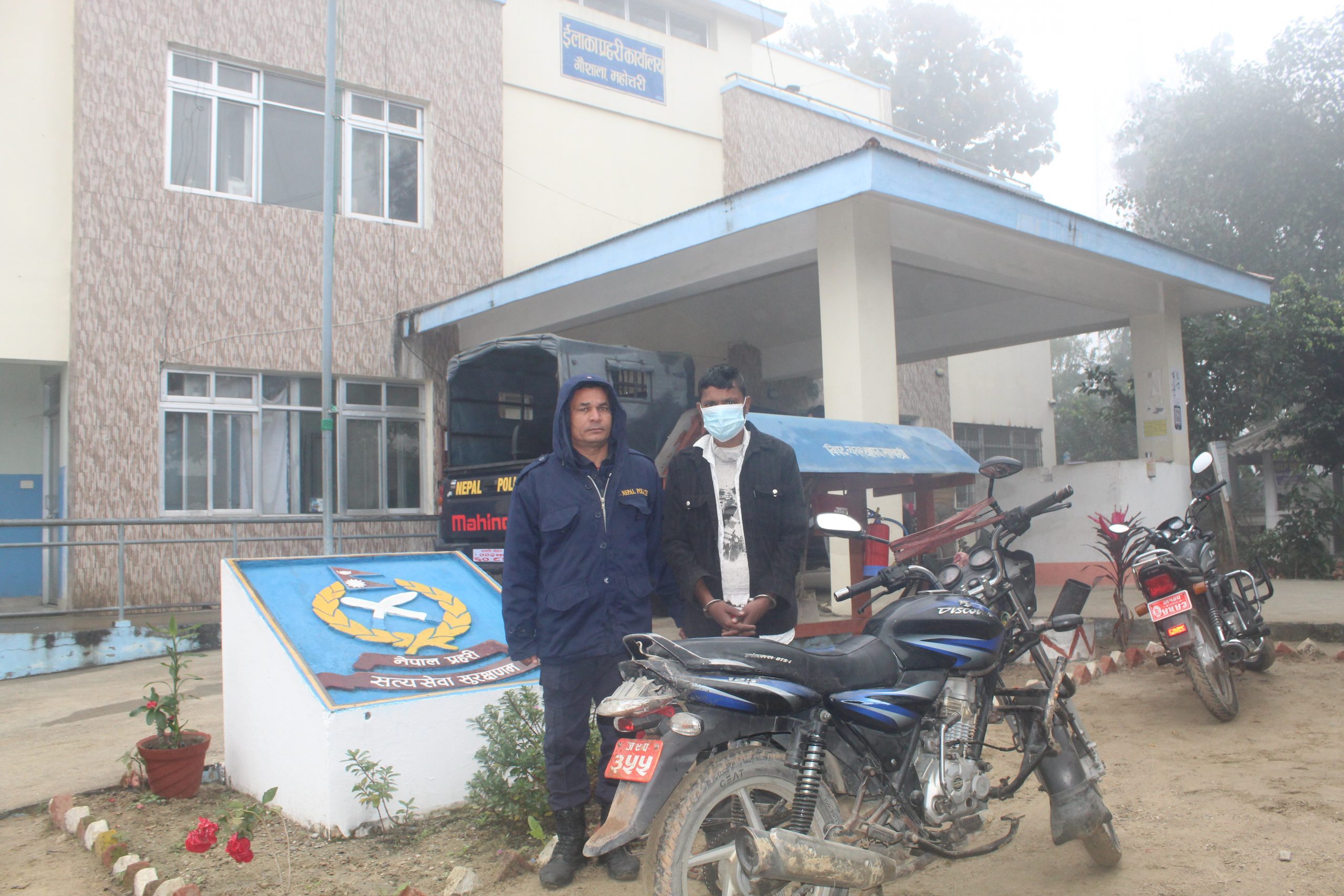 बुधबार बिहान करिब २ बजे गौशाला नगरपालिका –४ रजखोरस्थित विनोदकुमार सिंहले आफ्नो घर आँगनमा पार्किङ गरी राखेको ज ९ प ३५५ नम्बरको डिस्कभर मोटरसाइकल चोरी गरेर भाग्दै गर्दा चमारलाई पक्राउ गरेको प्रहरी प्रवक्ता प्रहरी नायब उपरीक्षक दिलीपकुमार गिरीले जानकारी दिए।